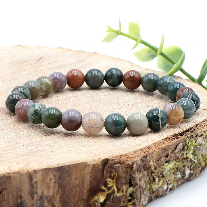 Braccialetti e pendenti in agata indiana. Ciottoli a forma di cuore, figurine e pietre levigate in agata indiana.