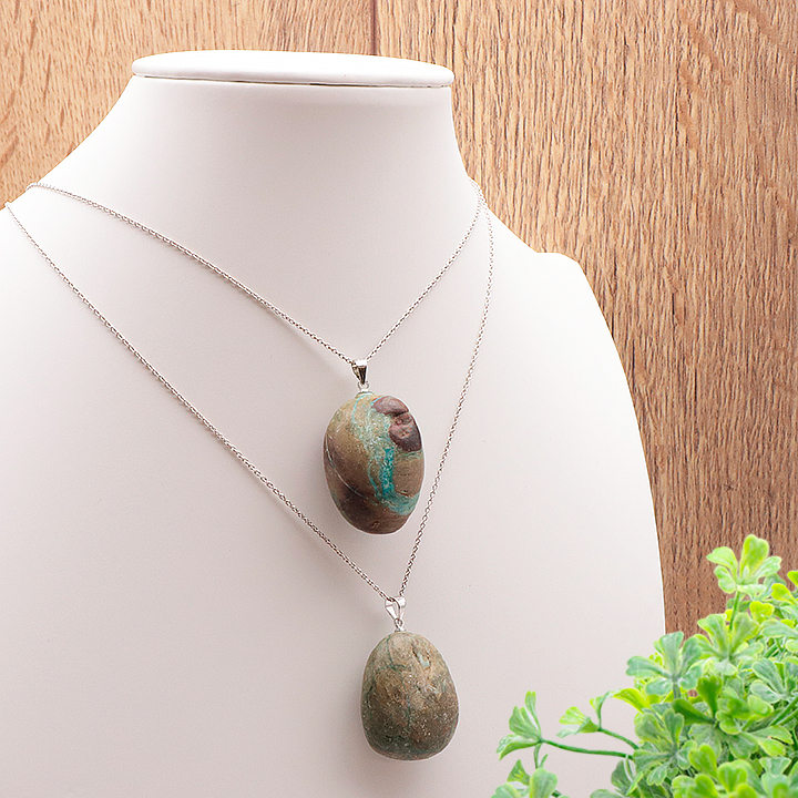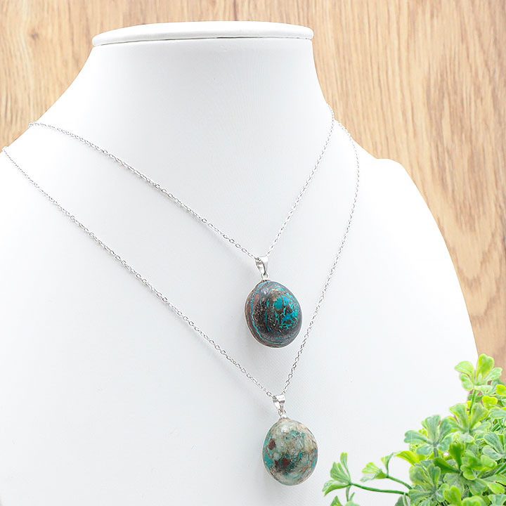 Braccialetti e pendenti in crisocolla. Pietre burattate di crisocolla.