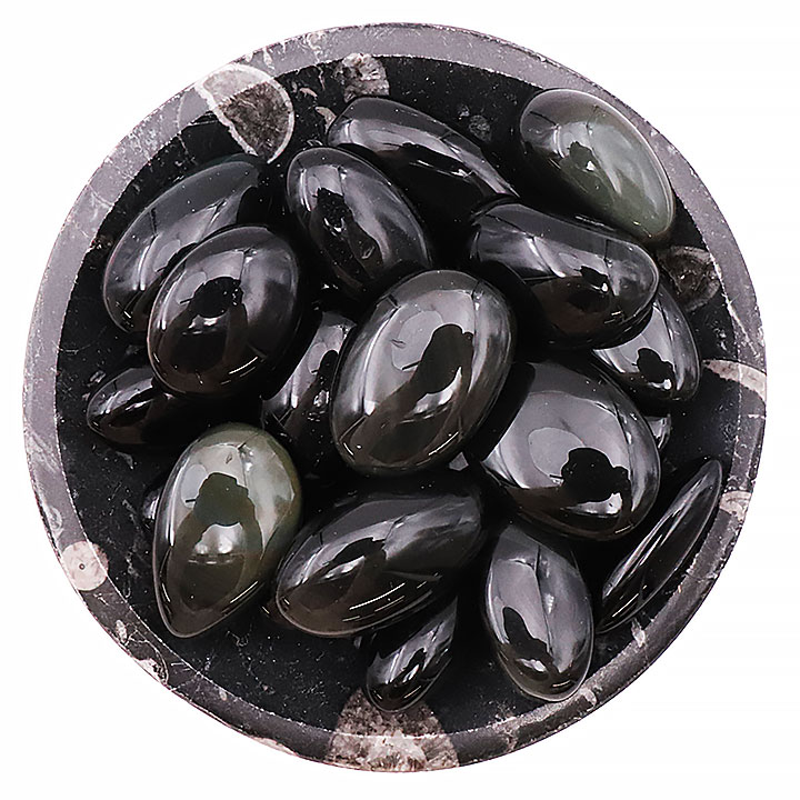 Ogni pezzo presenta riflessi unici, come un occhio mistico nella pietra nera.