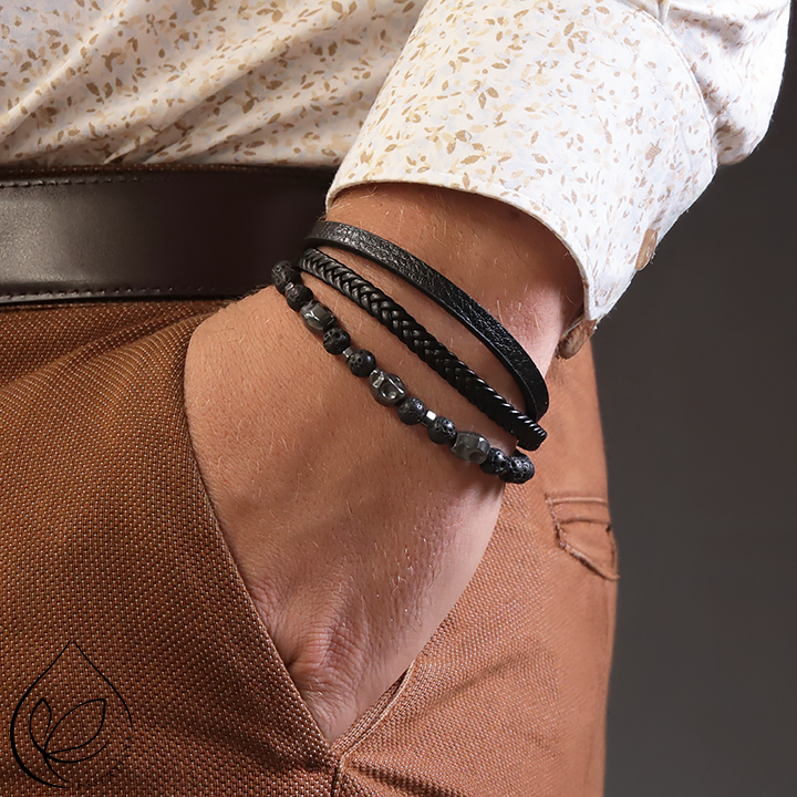 Taglia del bracciale: 18cmDiametro delle perle: 06mmDimensione dei ciondoli: 07mmLarghezza del cuoio artificiale: 06mmMetallo: Acciaio inossidabile. ✔ Inox 304 – Qualità professionaleI nostri gioielli sono realizzati in acciaio inossidabile 304, il riferimento mondiale per i gioielli durevoli e ipoallergenici. Questa lega garantisce brillantezza, resistenza e comfort quotidiano.*Per preservare i vostri gioielli, evitare il contatto con l'acqua.