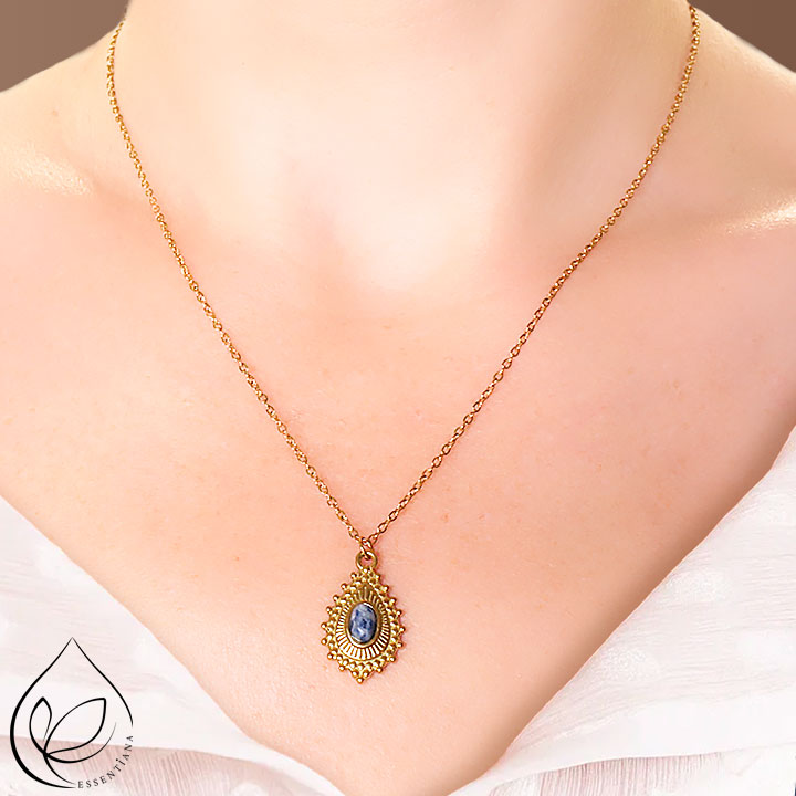 Dimensioni della collana: 44 a 49 cm Dimensioni della pietra (in mm): circa 04x06 Dimensioni del ciondolo (in mm): circa 14x22 Metallo: Acciaio Inossidabile. ✔ Inox 304 – Qualità professionale I nostri gioielli sono realizzati in acciaio inossidabile 304, il riferimento mondiale per gioielli durevoli e ipoallergenici. Questa lega garantisce brillantezza, resistenza e comfort quotidiano. *Per preservare i tuoi gioielli, evita il contatto con l'acqua.