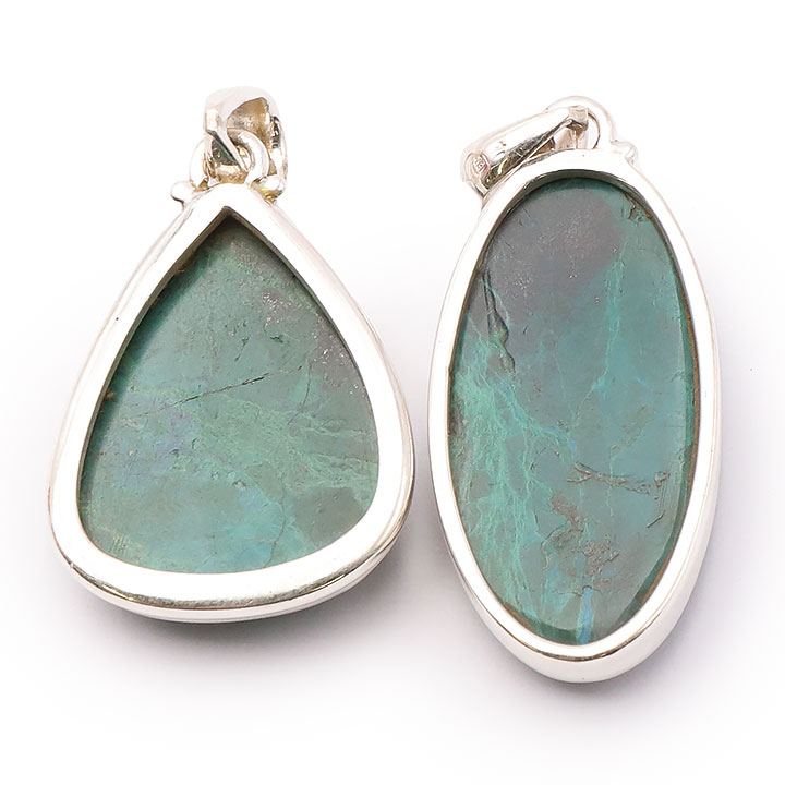 Tipo: Ciondoli - Argento 925 Pietra: Crisocolla Colore(i): Blu / Verde / Turchese Qualità: AA+ = Eccellente Peso del set: 28.01g Dimensioni del ciondolo più piccolo del set (senza b&ecute;liera): 32mm Dimensioni del ciondolo più grande del set (senza b&ecute;liera): 39mm
